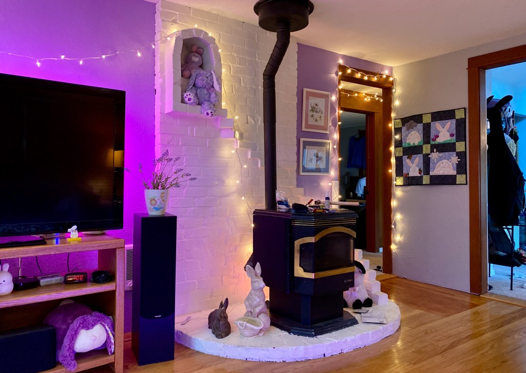 Today’s also a special day, because it’s Snowy’s anniversary, and her husband came into town for the day. (Yay, I like to see him, too.) We went together to pick him up from the train station. I was in the middle of a project at the time (I hung some extra lights in the hallway since it’s really dark), and had to leave quickly because his train came in early, but I did okay. I got really amped up on the ride into Seattle to the train station, but it worked out okay.